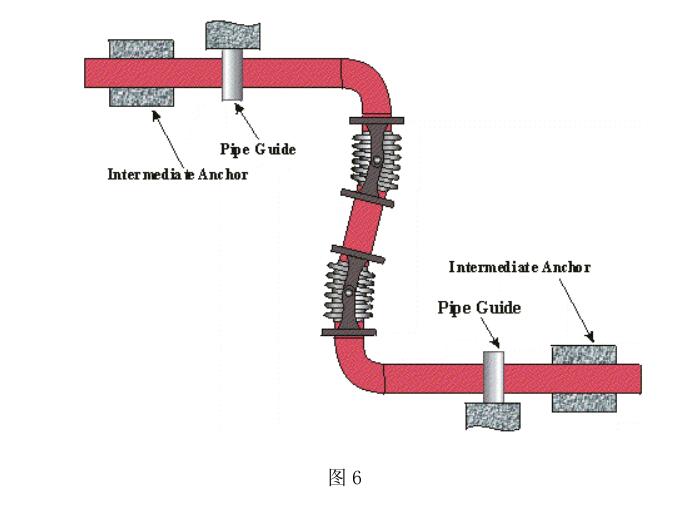 1) figure 6 is plain noodles with double hinge system absorbs the main thermal expansion, "Z" shaped bend due to pressure thrust is the hinge on the expansion joint to bear, just in the midst of piping at both ends fixed bracket, because of the expansion joint is conditioned by hinge can produce pure angular displacement, cannot scale, containing the expansion joint in the middle of the tube must be made with its vertical thermal expansion of the arm arm bent tube to absorb, two long arms bending deflection by proper design of the guide bracket and the bracket to control.