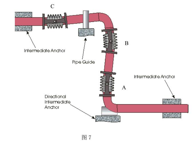(2) if the intermediate arm of the single-plane "Z" pipe system is too long, a system of three hinged expansion joints can be adopted. Figure 7 shows A three-hinged expansion joint system in A single-plane curved pipe. The thermal expansion of the vertical pipe segment will be absorbed by the actions of two expansion joints, B and C, while the thermal expansion of the horizontal pipe segment will be absorbed by two expansion joints, A and B. Obviously, the angular displacement of expansion joint B is the sum of A and C.