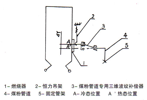 5.2对于200MW以上功率的大型火电机组,锅炉燃烧器与煤粉管道接口处的垂直位移200毫米以上,水平位移、40毫米以上,膨胀节要尽可能近燃烧器安装,并设置固定支架,隔离支架5以外管线的变形,使该补偿器主要吸收锅炉的位移,见下述三种安装方式: